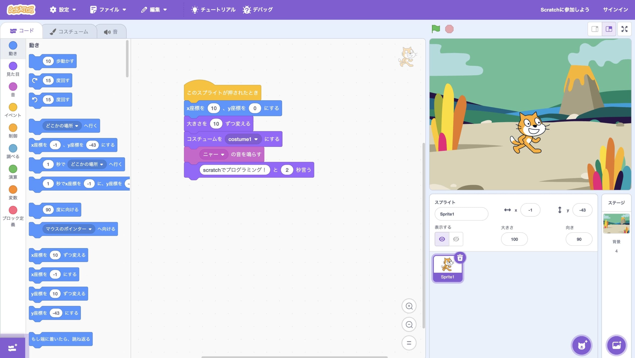 プログラミング学習といえば、もはやおなじみになっているのが「Scratch」と呼ばれるプログラミング言語学習環境です。Scracthはパソコンとネット環境があればどこでもプログラミングの考え方を学ぶことができ、プログラミング初心者であっても視覚的なプログラミングブロックを使って簡単にプログラムを組み立てることができます。